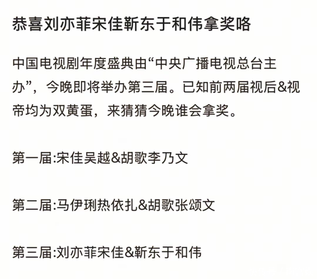 恭喜!刘亦菲接受官方表彰,凭借《玫瑰的故事》拿下总台视后,此前,刘亦菲曾靠《去有风的地方》首获提名,这次二度提名终于封后啦,和宋佳接受了双黄蛋表彰。接受表彰的现场将会在大年初一和大家见面,现在要留足悬念好好期待一下。